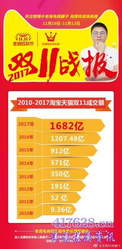 2017年天猫双11成交额公布 1682亿元再创奇迹! 0点钟声敲响,见证奇迹的时刻到了! 天猫双11成交额达到了1682亿元,无线占比90%,比去年整整多了475亿元,创造了全球零售史上的新纪录。 2017天猫双11,全球消费者通过支付宝完成的支付总笔数达到14.8亿笔,比去年增长41%。相当于在双11这一天,平均每个中国人在支付宝上完成超过1笔支付。 截至24点,11月11日24:00,2017天猫双11全球狂欢节全天物流订单8.12亿;全球225个国家和地区的剁手党加入2017天猫双11全球狂欢节。