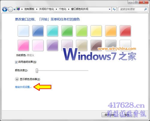 第一步:桌面空白处右键 -》个性化 》窗口颜色 -》 高级外观设置