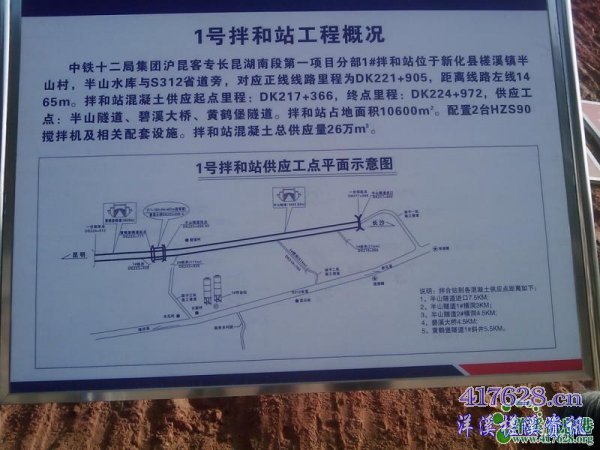中铁十二局1#拌合站设槎溪镇半山村,已正式投产,工程概况见图。