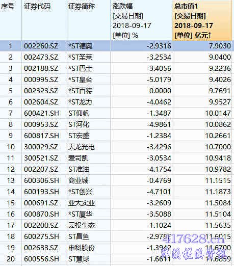 今日收盘,市值低于20亿元的个股399只;