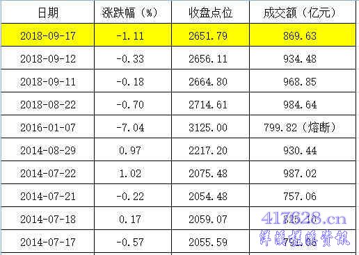 上证指数今日再度大跌1.11%,收报2651.79点,再创本轮调整以来收盘价新低,成交额869.6亿元,更是创2014年7月22日以来新低。两市合计成交额2066.67亿元,也是创4年来新低。